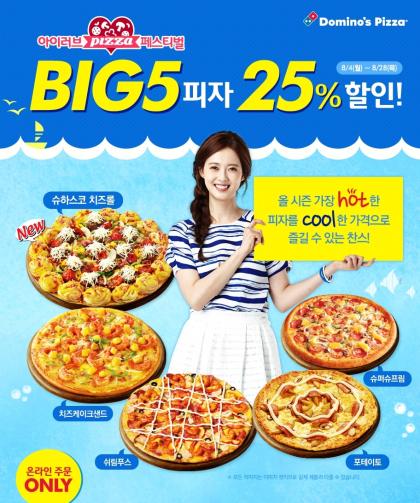 ‘Big 5 피자 25% 할인’은 도미노피자의 올여름 가장 핫한 제품 5종을 모아 25% 할인된 가격에 판매하는 이벤트로, 해당 제품은 브라질의 진한 맛을 느낄 수 있는 슈하스코 치즈롤 피자를 포함해 치즈케이크샌드, 쉬림푸스, 포테이토, 슈퍼슈프림 피자 등 총 5가지이며 라지 사이즈에 한한다.