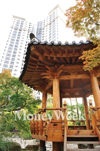 2단지의 첫인상은 웅장했다. 임 차장은 "부지 내에 존재하는 보전녹지지역을 최대한 조경에 반영해 '숲의 정원' 이미지를 표현했다"며 단지 중앙에 위치한 석산 '천선대'를 가리켰다. 기암괴석과 분재형 수목, 폭포 등으로 연출된 천선대는 금강산 천선대를 모티브로 조성했다고 한다. 마치 멋진 산을 바라보고 있는 듯한 느낌을 주는 것이 그야말로 장관이었다.