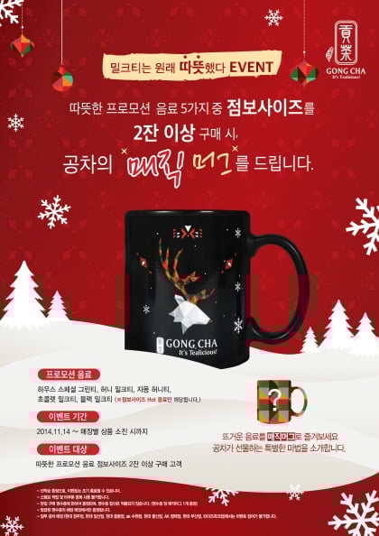특히 ‘매직 머그’에 뜨거운 음료를 넣어 마시면, 올 겨울 화이트 크리스마스를 기원하는 공차의 특별한 마법이 눈앞에 펼쳐진다.