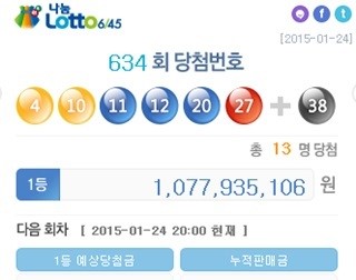 로또 634회 1등 당첨번호는 “4, 10, 11, 12, 20, 27”로, 보너스 번호는 38로 결정됐다.