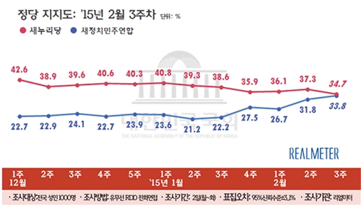 정당지지율에서 새누리당은 1주일 전 대비 2.6%포인트 하락한 34.7%를 기록했고, 새정치연합은 2.0%포인트 상승한 33.8%를 기록해 양당 격차는 0.9%포인트로 좁혀졌다. 작년 3월 새정치민주연합이 정당으로 공식 출범한 이래 가장 작은 격차고, 지지율로는 작년 6월 문창극 총리 후보 지명 후폭풍으로 35.0%를 기록한 이후 최고치로 집계됐다.