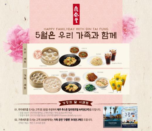 | ▲ 딘타이펑이 가정의 달을 맞아 오는 5월 31일까지 ‘5월은 우리 가족과 함께’ 이벤트를 진행한다. 정가대비 15% 할인된 기간 한정 메뉴 우리세트, 가족세트 출시 및 가족과 함께 즐기기 좋은 이벤트 제공된다 (제공=딘다이펑) @머니위크MNB, 유통 · 프랜차이즈 & 창업의 모든 것 |