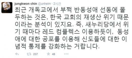그는 “최근 기독교에서 부쩍 반동성애 선동에 몰두하는 것은 한국교회의 재생산 위기 때문이라는 분석이 있다”면서 이 같이 밝혔다.