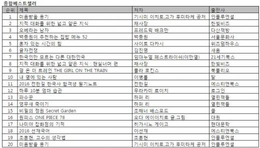 일본 인기 만화 <원피스 78>이 세 계단 하락한 16위를 기록했고, 히가시노 게이고의 <나미야 잡화점의 기적>은 두 계단 올라 17위를 차지했다. 공무원 수험서 <2016 선재국어>는 네 계단 내려가 18위에 머물렀고, 바둑고수 조훈현 9단의 인생을 위한 생각 복기법 <조훈현, 고수의 생각법>은 한 계단 하락한 19위를 기록했다. 공지영 작가의 에세이 <딸에게 주는 레시피>는 20위로 다시금 순위권에 얼굴을 내밀었다.