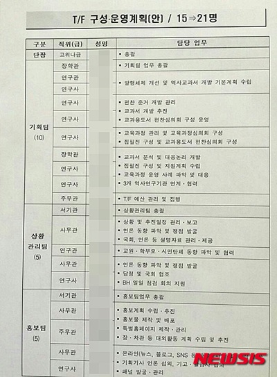 새정치민주연합 도종환 의원이 입수해 25일 공개한 '(한국사 교과서 국정화) T/F 구성 운영계획안'에 따르면, 교육부는 21명 규모의 TF를 구성하고 서울 종로구 대학로 국립국제교육원 내에 사무실에서 국정교과서 추진을 논의해왔다.