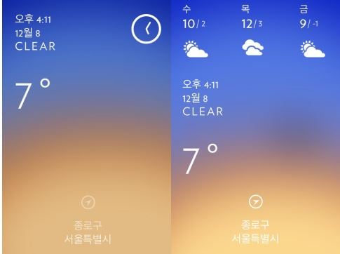 또 화면을 '아래-위'로 이동하면 우측 상단에 시계 표시가 보이면서 시간 변화에 따라 시시각각 변하는 예상 기온을 알려준다. 이 때 화면을 '아래-위' 또는 '위-아래'로 움직이면서 시간을 조정할 수 있다.
