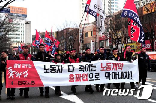 ‘현대차 노조’ 지난 16일 울산 민주노총 총파업 집회 참가자들이 시청 방향으로 거리행진을 하고 있다. /자료사진=뉴스1