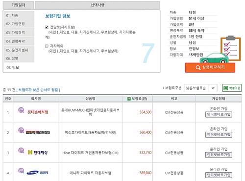 # ‘배기량 1000cc 기준의 경형자동차, 31세 여성, 최초 가입’. 최근 차량을 구입한 직장인 A씨가 온라인 보험슈퍼마켓 ‘보험다모아’ 사이트에서 자동차보험 상품을 검색했다. 자동차보험 코너에서 가입 선택사항을 클릭한 뒤 자동차보험 상품비교 버튼을 누르자 저렴한 보험료 순서대로 상품이 좌르르 펼쳐졌다. 최상단에 뜬 상품은 55만1420원의 ‘롯데하우머치인터넷개인용자동차보험’. ‘인터넷바로가입’ 버튼을 누르자 롯데손해보험 다이렉트 홈페이지가 뜬다.