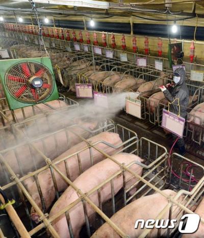 '구제역 의심신고' 구제역 확산을 막기위해 전국의 축산 시설과 차량에 대한 일제소독이 실시된 지난해 1월 충남 예산군의 한 돼지농가에서 관계자가 구제역 소독 작업을 하고 있다. /자료사진=뉴스1
