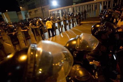| 지난해 2월 베네수엘라의 니콜라스 마두로 대통령이 카라카스 시장 안토니오 레데즈마를 쿠데타 음모혐의로 체포한 이후 카라카스 시내에서 항의시위를 막기 위해 국립경찰대이 저지선을 치고 있다. 사진제공=뉴시스(AP통신) |