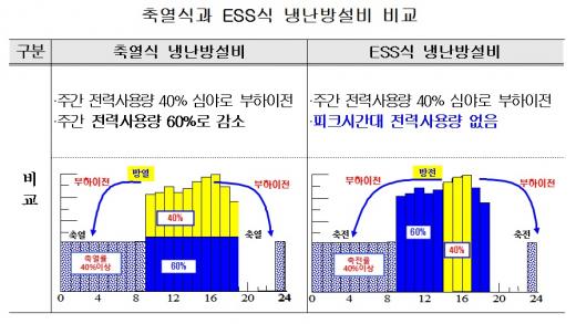 ESS식 냉난방설비는 밤 11시~아침 9시 심야시간대에 ESS를 충전 후 냉난방 최대 부하시간대 3~4시간 동안 방전해 에너지를 줄일 수 있다.