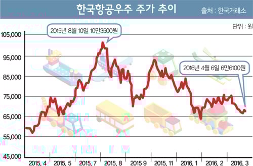 하지만 지난해 8월 이후 주가는 하락세로 접어들었다. 법원이 한국항공우주의 국내 공공기관 입찰 참가자격에 제동을 걸어서다. 한국항공우주는 전년도 매출액의 13%에 해당하는 약 3070억원의 거래를 중단했다. 약화일로를 걷던 주가는 지난해 말 주요주주 중 하나인 한화테크윈의 보유지분 매각소식이 전해지며 걷잡을 수 없이 폭락했다.
