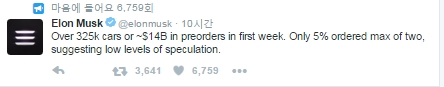 엘론 머스크 테슬라 최고경영자(CEO)는 이날 자신의 트위터를 통해 “모델3 예약이 첫째주에만 32만5000대, 140억달러(약 16조2000억원)를 넘어섰다”고 전했다.