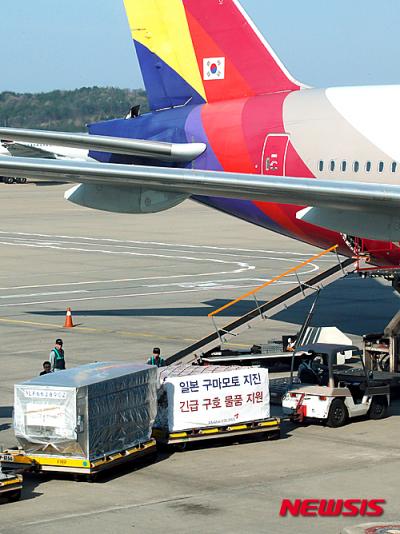 아시아나항공은 "오늘(19일) 인천·후쿠오카를 운항하는 여객기(OZ132편)에 기내 담요 1000장을 싣고 구마모토 지진 피해지역으로 긴급 수송했다"고 밝혔다.