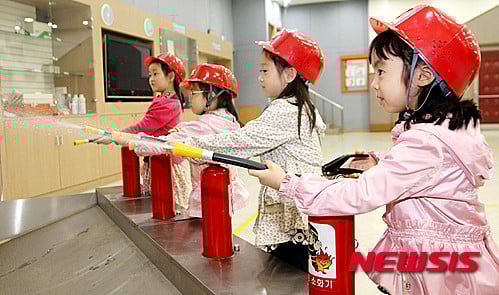 어린이날(5일)을 이틀 앞둔 지난 3일 오전 서울 양천구 목동서로 양천소방서 안전체험교실을 찾은 유치원생들이 소화기 사용법을 익히고 있다. /자료사진=뉴시스
