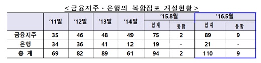 금융위원회는 지난달 말 현재 5개 금융지주와 2개 은행에서 총 110개의 금융복합점포를 운영하고 있다고 10일 밝혔다.금융지주의 경우 은행·증권형 복합점포가 대부분(80개)이며 기업은행과 우리은행이 21개를 운영하고 있다.