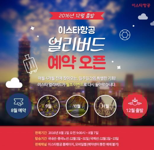이스타항공 관계자는 “매월 1일부터 7일까지 탑승기간 4개월 전 찾아오는 얼리버드 이벤트를 이용하면 더욱 실속 있는 항공 여행을 즐길 수 있을 것”이라고 전했다.