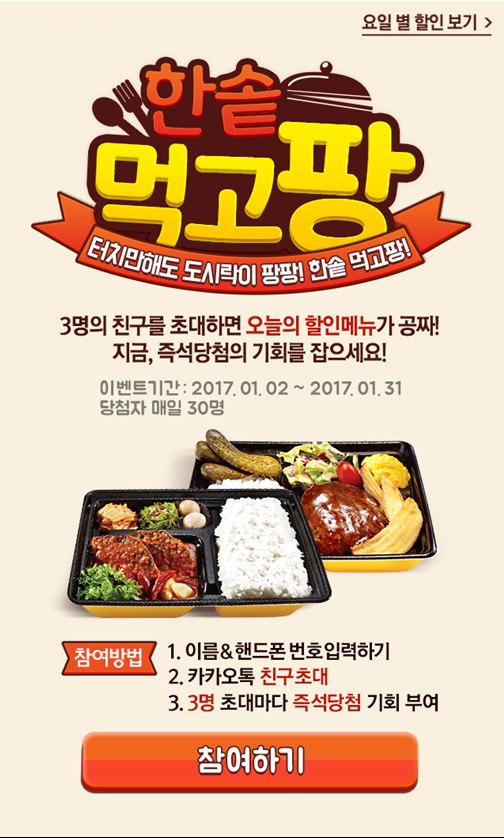 또한, 한솥도시락은 새로운 이벤트로 ‘한솥 먹고팡 이벤트’도 실시한다. 이는 매일 중복참여가 가능하며 즉시당첨 여부를 확인 할 수 있다. 1월 31일까지 매일 30씩 총 900명이 당첨된다. 이벤트 참여방법은 한솥도시락 홈페이지에서 확인할 수 있다.