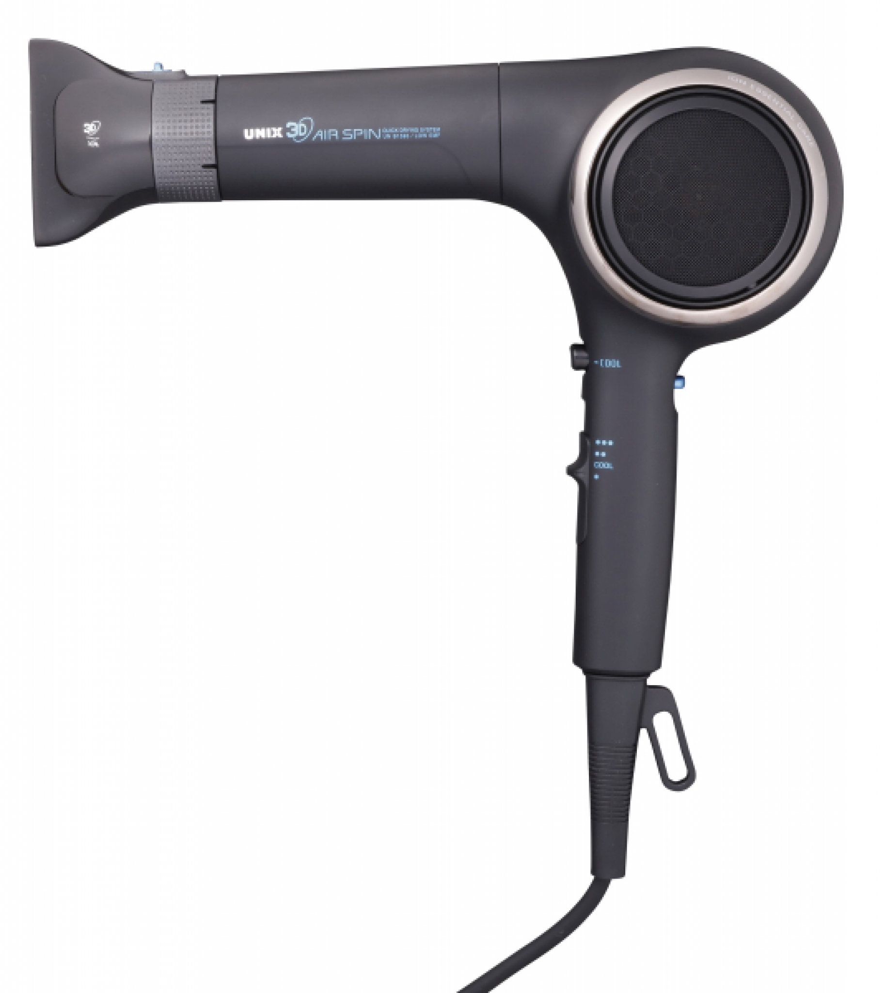 유닉스전자의 ‘3D 에어 스핀’은 상하좌우 360도 회전하는 프로펠러가 장착되어 바람이 두피부터 모발까지 고르게 전달된다. 강력한 회오리 바람이 두피를 자극해 건강하고 찰랑거리는 모발을 유지하는데 도움을 주고 음이온 에센셜 케어 기능이 먼지 흡착을 방지하고 모발 내 수분 밸런스를 유지시켜준다.