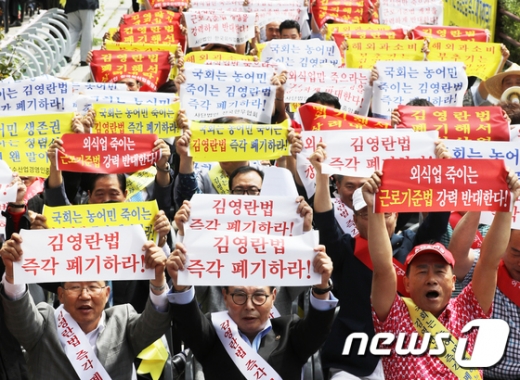 29일 서울 여의도 국회 인근에서 열린 '서민경제 발목잡는 김영란법 중단 및 근로시간 단축저지 규탄대회'에서 직능경제인단체총연합회와 골목상권살리기소비자연맹 회원 등이 김영란법 폐기와 근로기준법 개정안 반대 등의 구호를 외치고 있다. /사진=뉴스1