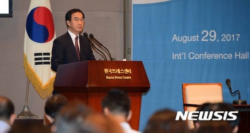 조명균 통일부 장관이 지난달 29일 오후 서울 중구 프레스센터 국제회의장에서 열린 '2017 대북지원 국제회의'에서 기조연설을 하고 있다. /자료사진=뉴시스