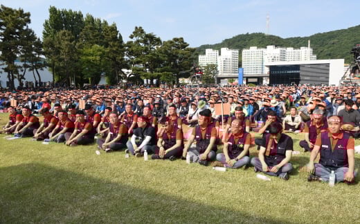 금속노조 현대자동차지부가 지난 6월 현대차 울산공장 광장에서 조합원 출정식을 열고 올해 단체교섭에서 승리할 것을 결의하는 모습. /사진=뉴시스 DB