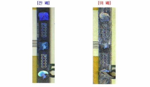 KEB하나은행은 최근 5만원권에 적용된 위변조 방지 장치를 정교하게 모방한 신종 위조지폐를 발견했다고 23일 밝혔다.