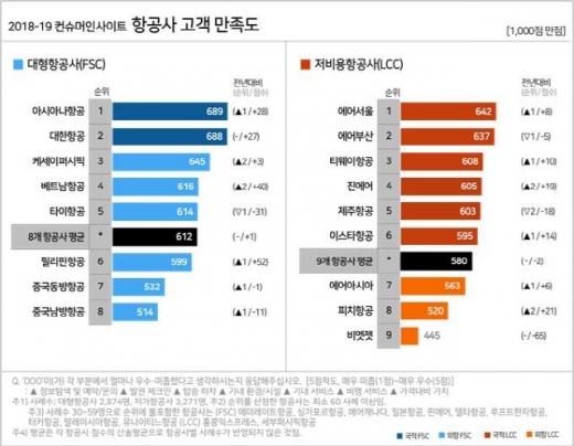 이는 여행 전문 리서치 컨슈머인사이트가 매년 수행하는 '여행상품 만족도 조사'에서 지난 1년간(2018년 9월~2019년 8월) 항공사를 이용한 고객을 대상으로 실시한 만족도 조상 따른 것이다.