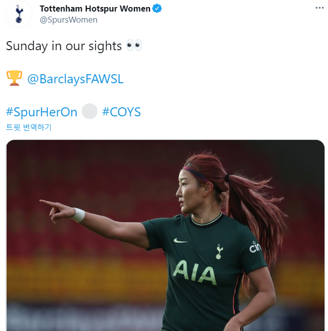 토트넘 위민은 11일(이하 현지시간) 공식 트위터 계정에 "우리 시점에서 본 일요일"이라는 문구와 함께 조소현의 사진을 게재했다. 사진 속 조소현은 어딘가를 주시하며 마치 경고하듯 손가락으로 무언가를 가리키고 있다.