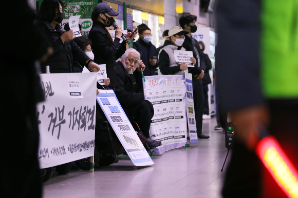 23일 박경석 전장연 공동상임대표는 이날 오전 8시15분쯤부터 1호선 시청역 승강장에서 기자회견을 열고 "기자회견을 마치면 시청역 1호선을 중심으로 탑승해서 선전전을 진행할 예정"이라고 밝혔다.