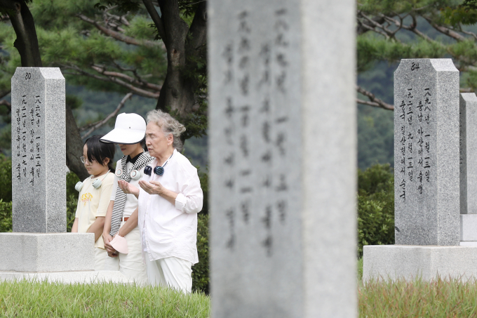 병무청이 지난 14일 사후 국립현충원·호국원에 안장되는 국가유공자의 병적기록이 실제와 다를 경우 정정하는 방식을 간소화하기로 했다. 사진은 지난 14일 오후 서울 동작구 국립서울현충원 애국지사 묘역에서 추모하는 독립운동가 박재혁 선생의 손녀 박정영 어르신(78세)와 가족들. /사진=뉴스1