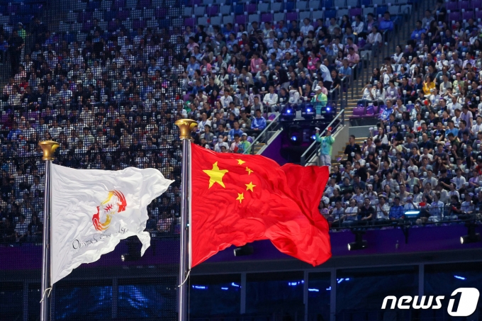 (항저우(중국)=뉴스1) 민경석 기자 = 23일 오후 중국 항저우 올림픽 스포츠센터 스타디움에서 열린 '2022 제19회 항저우 아시안게임' 개회식에서 오성홍기가 아시아올림픽평의회 깃발과 함께 게양대에서 펄럭이고 있다. 2023.9.24/뉴스1