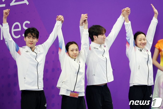 27일 오후 중국 항저우 올림픽 스포츠센터 수영장에서 열린 2022 항저우 아시안게임 혼성 혼계영 400m에서 3위를 차지한 대한민국 황선우(왼쪽부터)와 김서영, 최동열, 이은지가 시상대에 오르고 있다. 2023.9.27/뉴스1 ⓒ News1 민경석 기자
