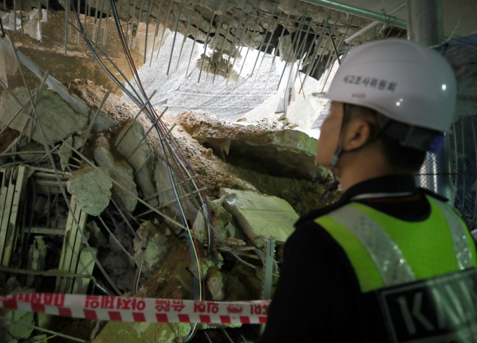 국토안전관리원 관계자가 지난해 5월2일 인천광역시 서구 검단의 한 아파트 지하주차장 붕괴 현장을 확인하고 있다. /사진=뉴스1