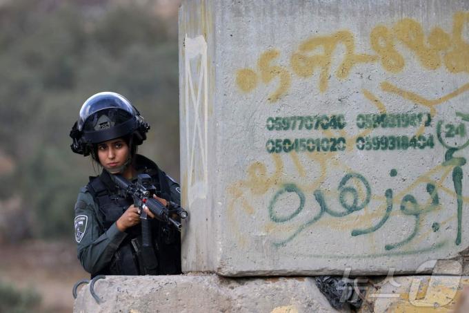 (타르쿠미야 AFP=뉴스1) 강민경기자 = 이스라엘 보안군 여군병사가 1일 요르단강 서안 헤브론 북부 타르쿠미야 교차로에서 엄폐한 채 경계를 펴고 있다. 타르쿠미야 교차로는 이스라엘군이 대대적 군사작전을 펴고 있는 서안지구의 팔레스타인 주민들을 위한 인도적 구호물품을 실은 차량들이 지나는 곳으로 이를 방해하려는 이스라엘 정착민을 향한 총격이 발생했다. 2024.09.01