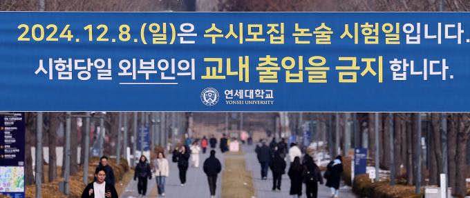 경찰이 2025학년도 연세대학교 수시모집 자연계열 논술시험 문제 온라인 유출과 관련해 피의자 8명을 확인했다고 전했다. 사진은 지난 1일 서울 서대문구 연세대학교에 추가 논술시험 관련 현수막이 걸려 있는 모습. /사진=뉴스1