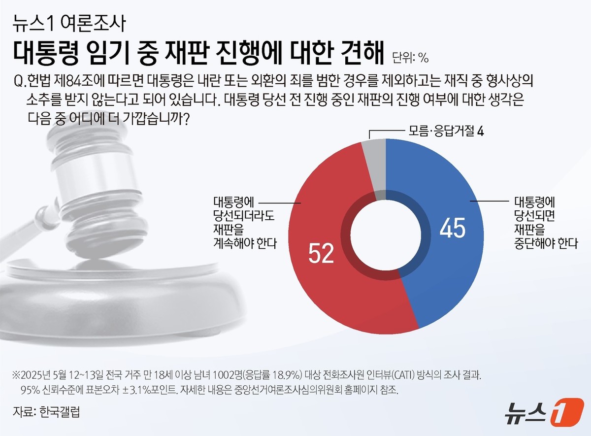 뉴스1이 여론조사업체 한국갤럽에 의뢰해 지난 12~13일 전국 18세 이상 남녀 1002명에게 '대통령 당선 전 진행 중인 재판의 진행 여부에 대해 어떻게 생각하는가'라고 묻자 응답자의 52%는 '대통령에 당선되더라도 재판을 계속해야 한다'고 했다.