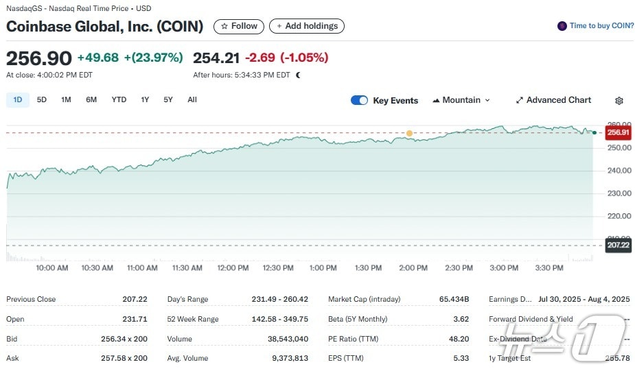 이는 일단 코인베이스 호재 때문이다. 앞서 미국증시에서 코인베이스는 23.97% 폭등한 256.90달러로 장을 마감했다.