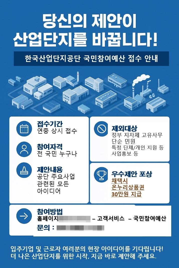 한국산업단지공단이 산업단지의 지속가능한 발전과 현장 중심의 예산 편성을 위해 2025년도 국민참여예산 제안 아이디어를 연중 접수한다.