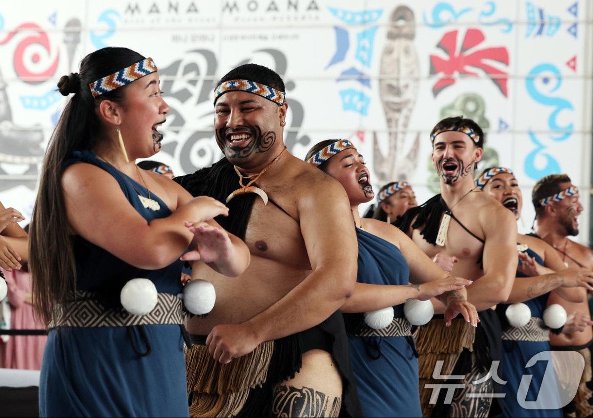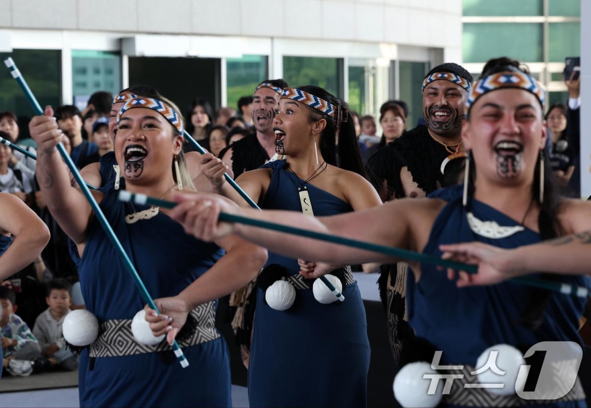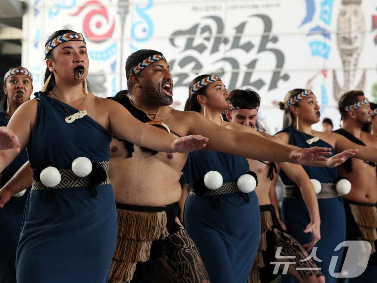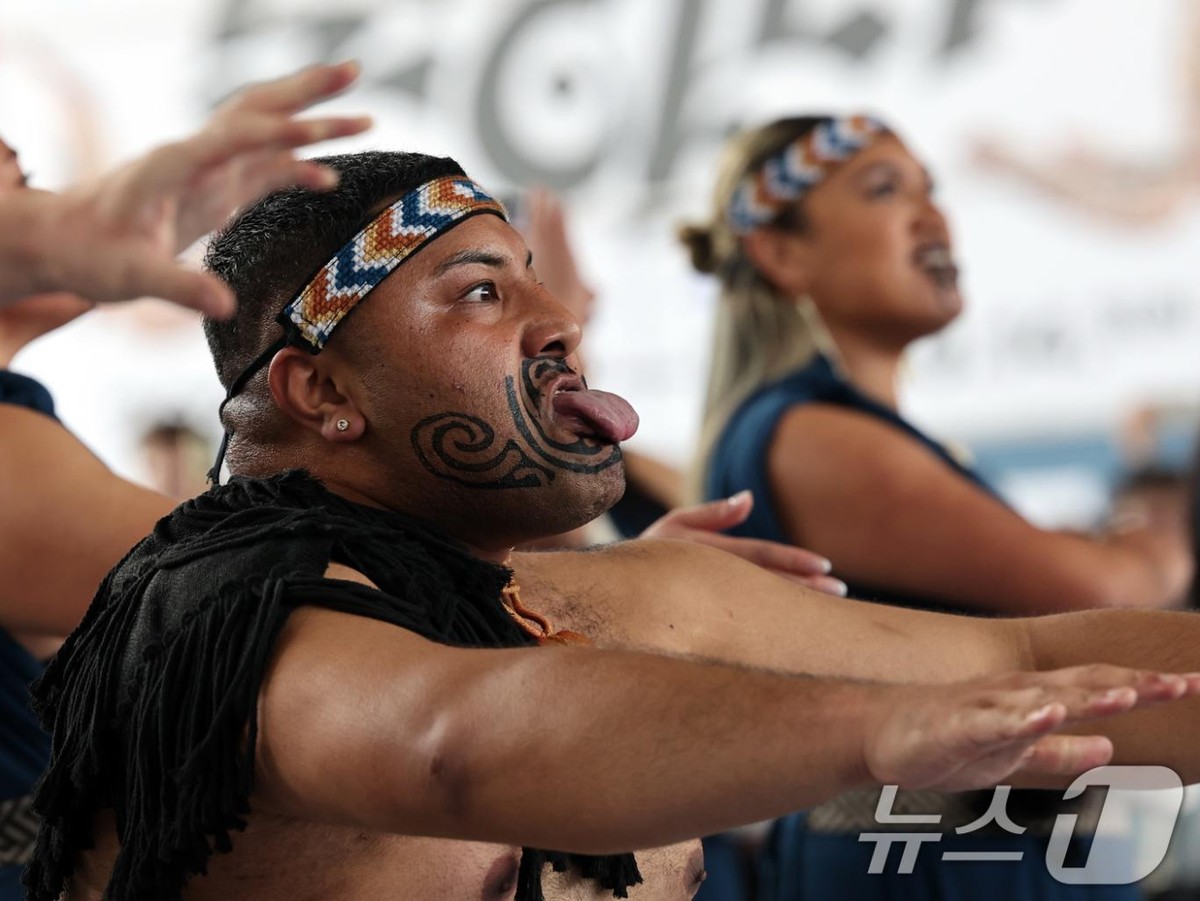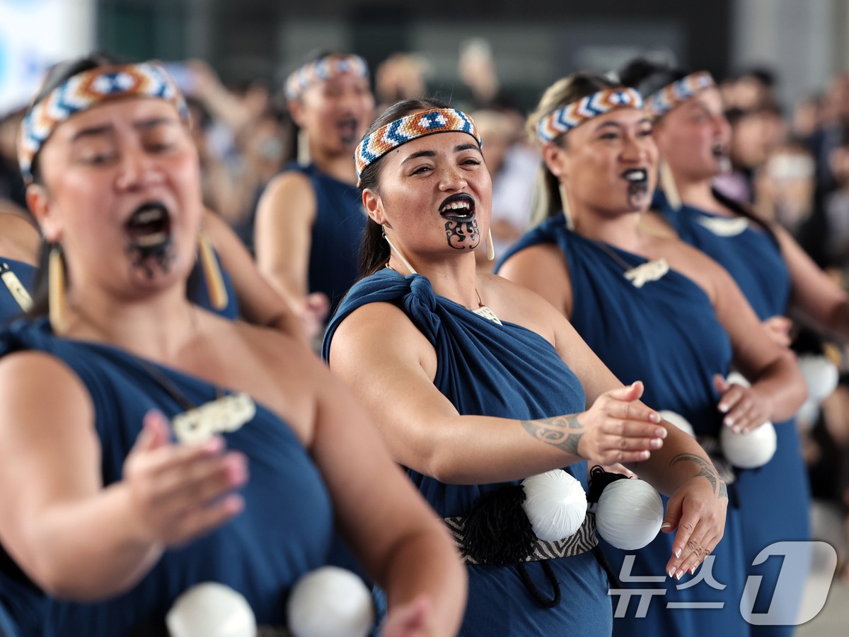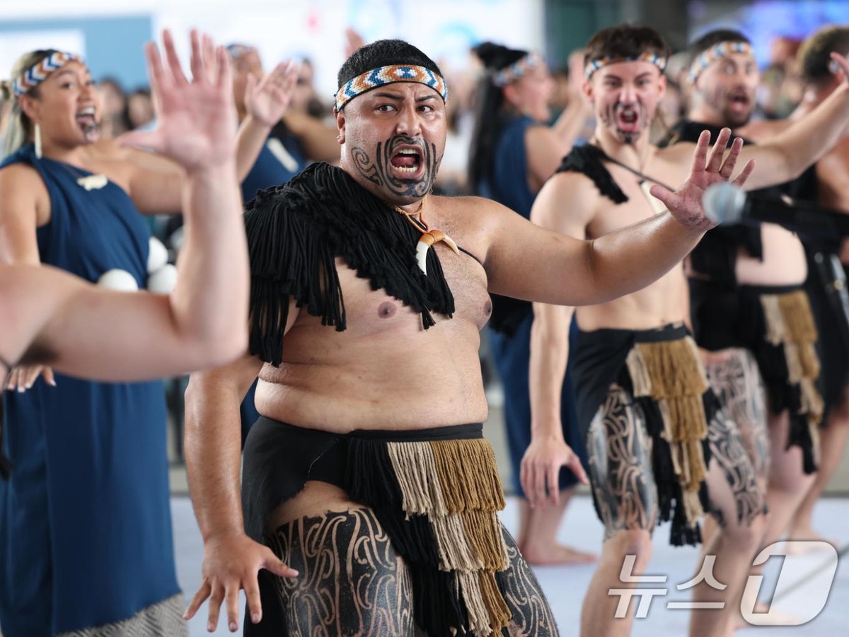 (서울=뉴스1) 황기선 기자 = 국립중앙박물관과 주한 뉴질랜드대사관은 공동으로 26일 오후 서울 용산구 국립중앙박물관 열린마당에서 특별전 '마나 모아나-신성한 바다의 예술, 오세아니아'를 기념해 '마오리 카파 하카' 공연을 선보였다.