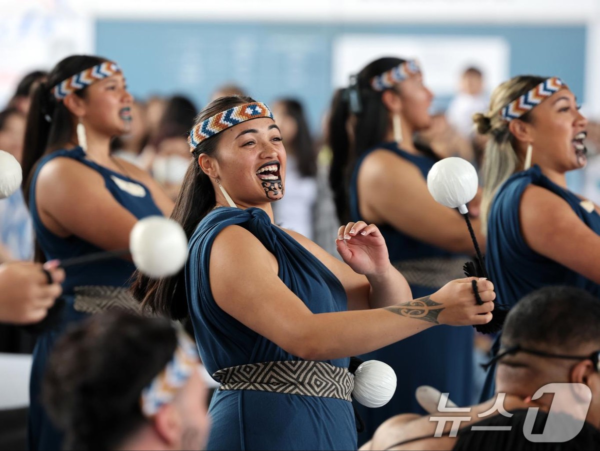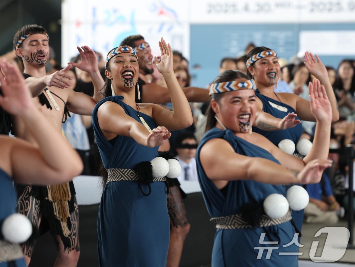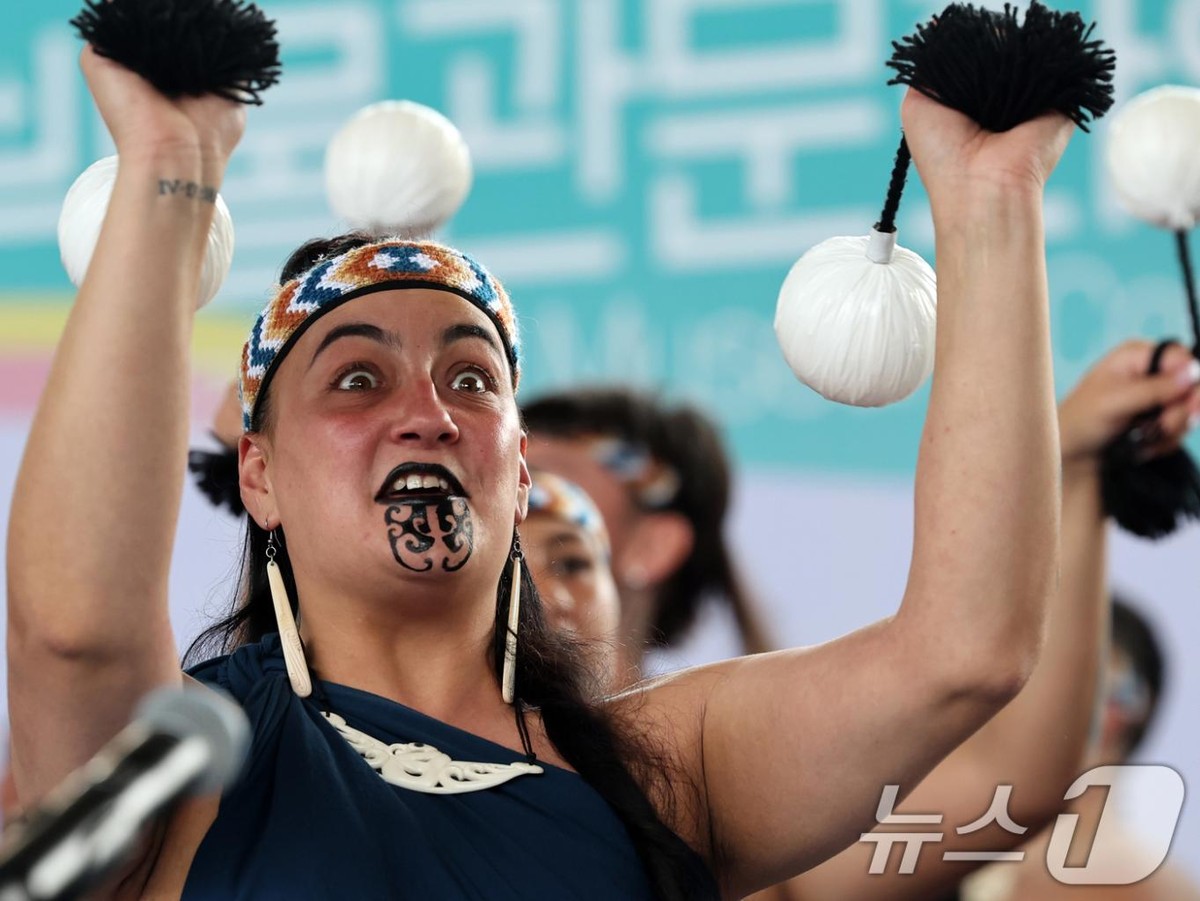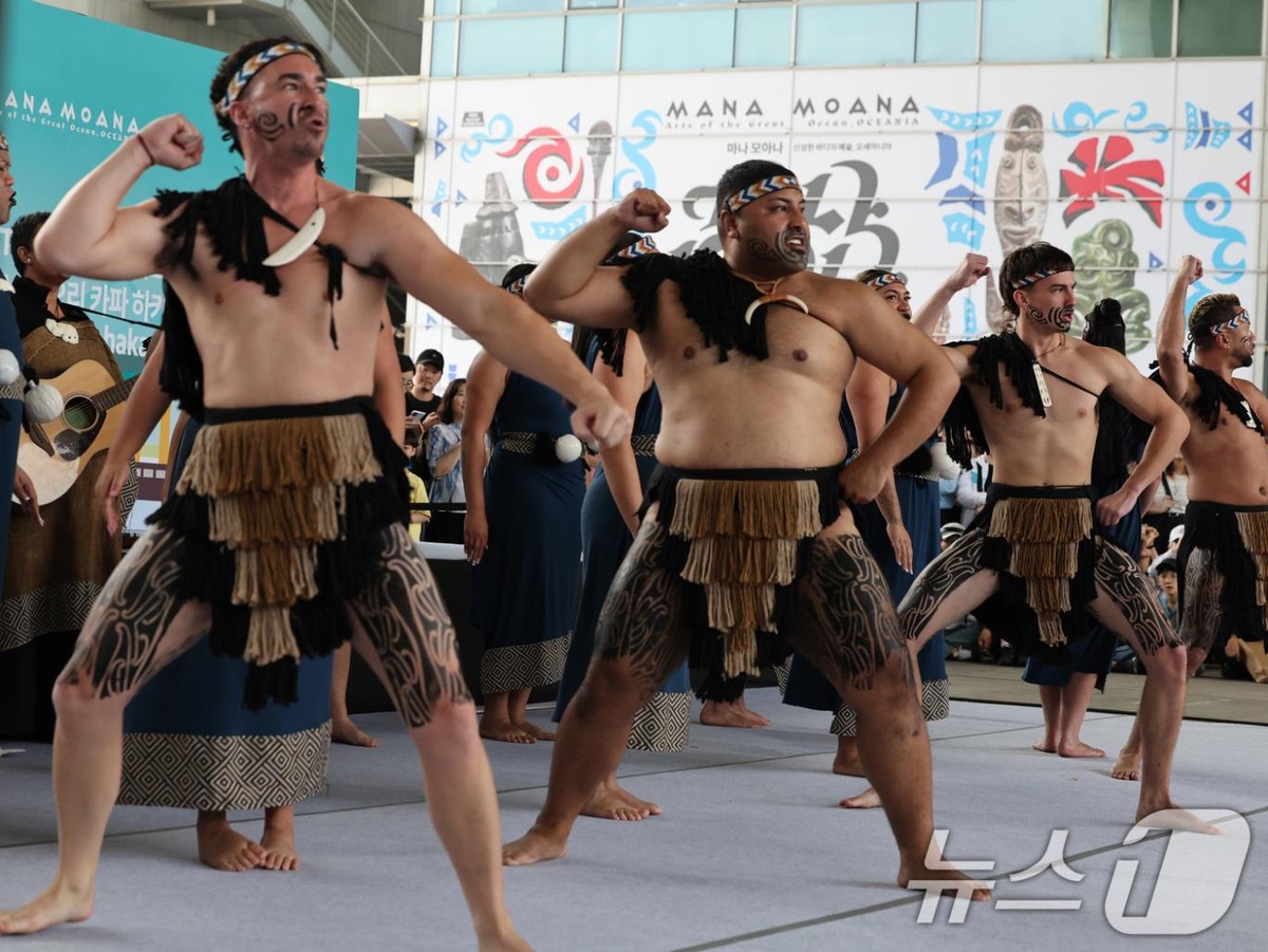 26일 오후 서울 용산구 국립중앙박물관 열린마당에서 그룹 '히와(HIWA)'가 '마나 모아나-신성한 바다의 예술, 오세아니아' 특별전 기념 마오리 '카파 하카(kapa haka)' 공연을 선보이고 있다. '카파 하카'는 노래, 연주, 춤을 아우르는 마오리의 대표적인 공연예술이다. 카파는 '그룹'을, 하카는 '춤'을 뜻하며, 마오리들이 노래와 춤으로 자신들의 전통과 폴리네시아 문화의 정체성을 표현하는 중요한 방식이다. 2025.5.26/뉴스1 ⓒ News1 황기선 기자
