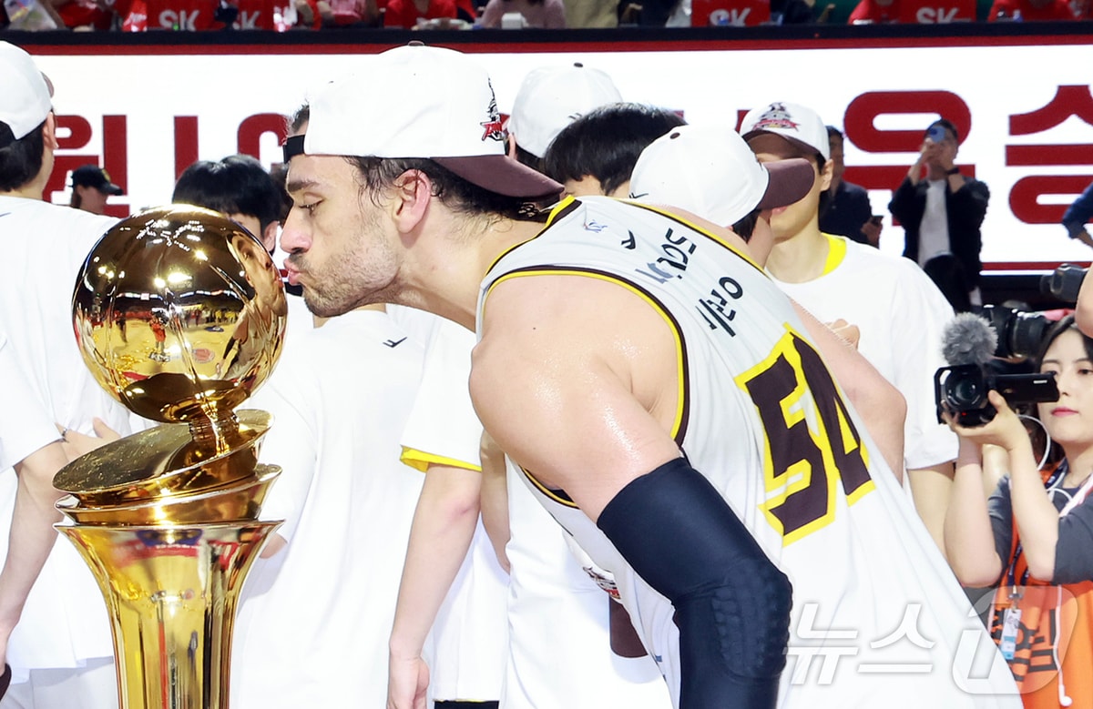 17일 오후 서울 송파구 잠실학생체육관에서 열린 '2024-25 KCC 프로농구 챔피언결정전 7차전' 서울 SK 나이츠와 창원 LG 세이커스의 경기, 62대58로 승리하며 창단 28년 만에 첫 우승을 달성한 창원 LG 아셈 마레이가 우승 트로피에 키스를 하고 있다. 2025.5.17/뉴스1 ⓒ News1 김진환 기자