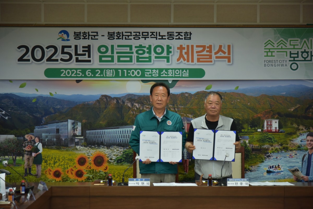 봉화군과 봉화군공무직노동조합이 2025년 임금협약 체결식을 갖고 조합원 처우 개선과 조직 안정을 위한 임금과 일부 수당 조정에 공식 합의했다고 2일 밝혔다.