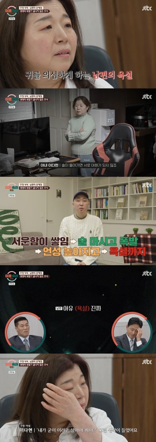 아내가 인터뷰를 통해 "술이 들어가니까 대화가 되지 않는다. 그런데 얘기를 하고 싶어 하고, 그게 너무 싫다"라며 속상해했다. 남편은 "서운함이 쌓여서 술 마시고, 폭발하고, 언성이 높아지고, 욕하게 된다"라고 주장했다.