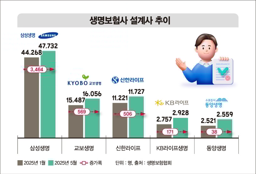 업계 1위인 삼성생명의 설계사(전속설계사, 교차설계사 합계)는 1년새 5000명 넘게 증가한 반면 교보생명은 불과 1000명 넘게 증가했기 때문이다.