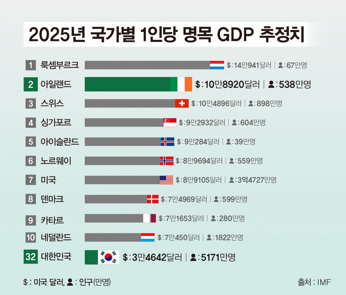 수백만명은 감자 대기근(1845~1852년)으로 굶주림에 쓰러졌고, 수백만명은 살기 위해 낯선 땅으로 떠났던 나라. 한때 '유럽의 가난한 늙은 여인'으로 불리던 아일랜드가 이제는 세계에서 가장 잘사는 나라로 변신했다. 인구 530만명의 이 작은 섬나라는 1970년대까지만 해도 유럽의 최빈국이었지만 2024년 1인당 국내총생산(GDP)이 10만달러를 넘어 세계 2위에 올랐다. 불과 한 세대 만에 이뤄낸 압축 성장이다.