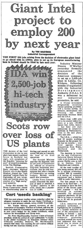 인텔은 더블린 서부 리크슬립(Leixlip)에 첫 반도체 공장, '팹'(Fab)을 짓기로 결정했고 아일랜드 정부는 이에 8700만파운드(약 1500억 원)에 달하는 자본 보조금을 지원했다. 이밖에도 IDA는 인허가 밀착 지원, 연구개발(R&D) 세액공제, 인재 육성 등 원스톱 지원 체계를 전면에 내세웠다. 당시 IDA는 해외로 이주했던 핵심 기술 인력을 다시 불러들이는 데까지 나서는 등 숙련된 노동력을 제공하기 위해 총력을 기울였다.