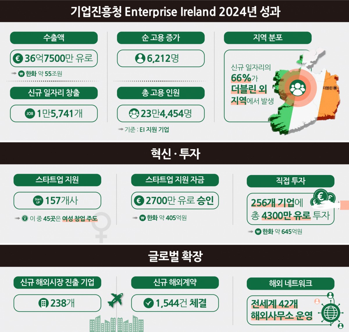 EI는 외국인 직접 투자를 유치하는 투자개발청(IDA)과 함께 아일랜드 경제를 떠받치는 '쌍둥이 엔진'이다. IDA가 글로벌 기업을 아일랜드로 불러오는 역할을 한다면, EI는 자국 기업이 세계적인 경쟁력을 갖추고 해외로 뻗어나갈 수 있도록 지원하는 임무를 맡고 있다.