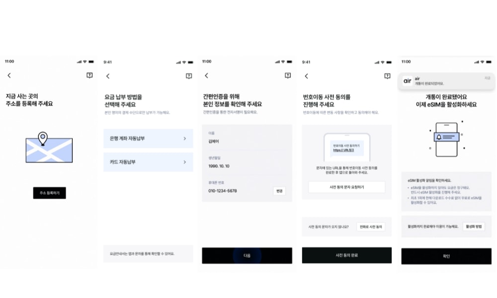 오는 13일 출시되는 '에어' 전용 앱을 통해 가입·개통·해지·상담·부가서비스 신청까지 전 과정을 직접 처리할 수 있다. 복잡하고 어려웠던 회선 가입 과정을 쉽고 빠르게 바꿨다. 고객이 직접 입력해야 하는 단계를 최소화하고 ▲즉시 개통이 가능한 이심 우선 지원 ▲신청 후 당일 수령 가능한 유심(USIM) 배송 ▲해피콜 없는 자동 유심 개통으로 빠른 셀프 개통을 지원한다.