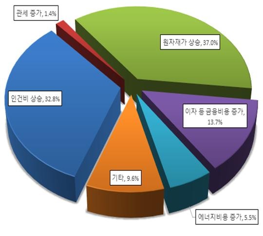 기업들은 경영 애로 요인으로 원자재 가격 상승(37.0%)과 인건비 상승(32.8%), 금융비용 증가(13.7%) 등을 지목했다. 생산·조직 관리 측면에서는 기업 자금 사정(32.8%)과 인력 수급(28.1%) 문제가 가장 크게 나타났다.